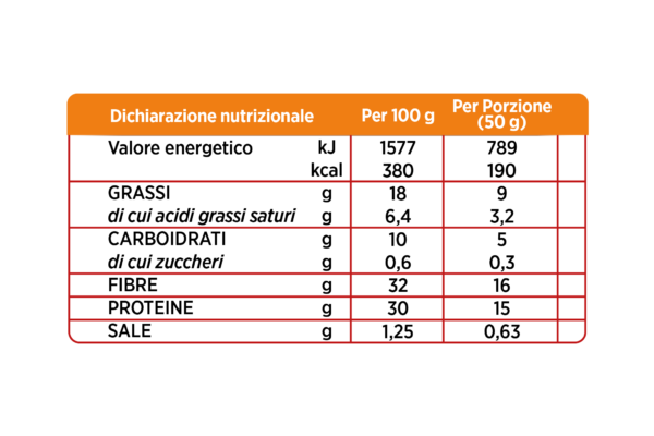 INGREDIENTI: Fibre di frumento (glutine), proteine di frumento, burro di karitè, proteine del latte, olio extravergine di oliva, proteine del pisello, olio di girasole, albume d’uovo in polvere, amido di frumento modificato, emulsionanti: mono e digliceridi degli acidi grassi, lecitina di girasole; agenti lievitanti: carbonato acido di sodio, carbonato di ammonio; sale, origano 1,1%, aromi.