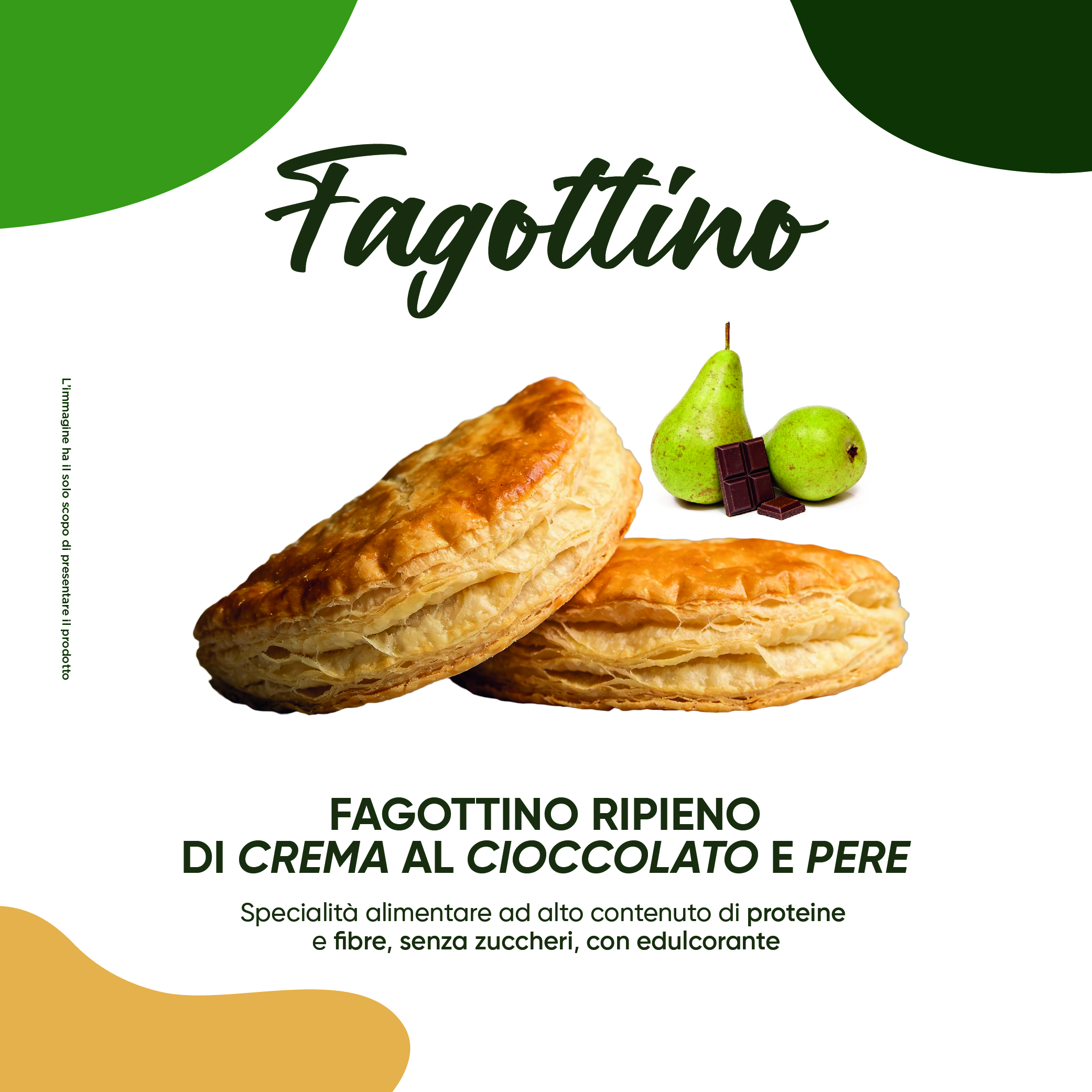 INGREDIENTI: Burro (latte), proteine del grano (glutine), olio di girasole altoleico, proteine della soia, farina di mandorle, proteina del pisello, farina di semi di lino, inulina, farina di soia, crema pasticcera al cioccolato: (edulcorante: maltitolo; tuorlo d’uovo, latte in polvere scremato, cioccolato 8%, amido modificato, burro di cacao), sale, lievito di birra, conservante: sorbato di potassio; pera a cubetti 1%.