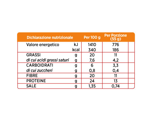INGREDIENTI: Proteine di frumento (glutine), fibra di frumento, acqua, burro di karitè, inulina, olio di girasole alto oleico, crusca di riso, olio extravergine di oliva, albume d’uovo in polvere, amido di frumento modificato, lievito madre essiccato, emulsionanti: mono e digliceridi degli acidi grassi, lecitina di girasole; lievito, sale, conservante: sorbato di potassio; aromi. Può contenere tracce di frutta a guscio, arachidi, latte, sesamo, lupini e soia.