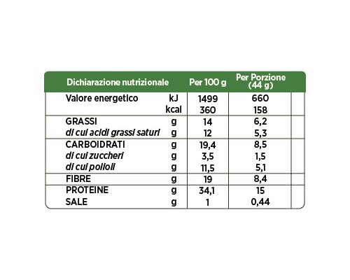 INGREDIENTI: Miscela proteica: proteine della soia, amido; proteine del latte, albume d’uovo in polvere; polidestrosio; oli vegetali: olio di palmistico certificato RSPO, olio di cocco biologico, olio di palma certificato RSPO, olio di Karitè; edulcoranti: maltitolo, sucralosio; umettante: glicerolo; oligofruttosio, crisps di riso, yogurt in polvere (latte), latte scremato in polvere, aromi, emulsionante: lecitine; addensante: agar-agar; sale, antiossidante: estratto ricco di tocoferoli. Può contenere tracce di frutta a guscio. Con edulcoranti