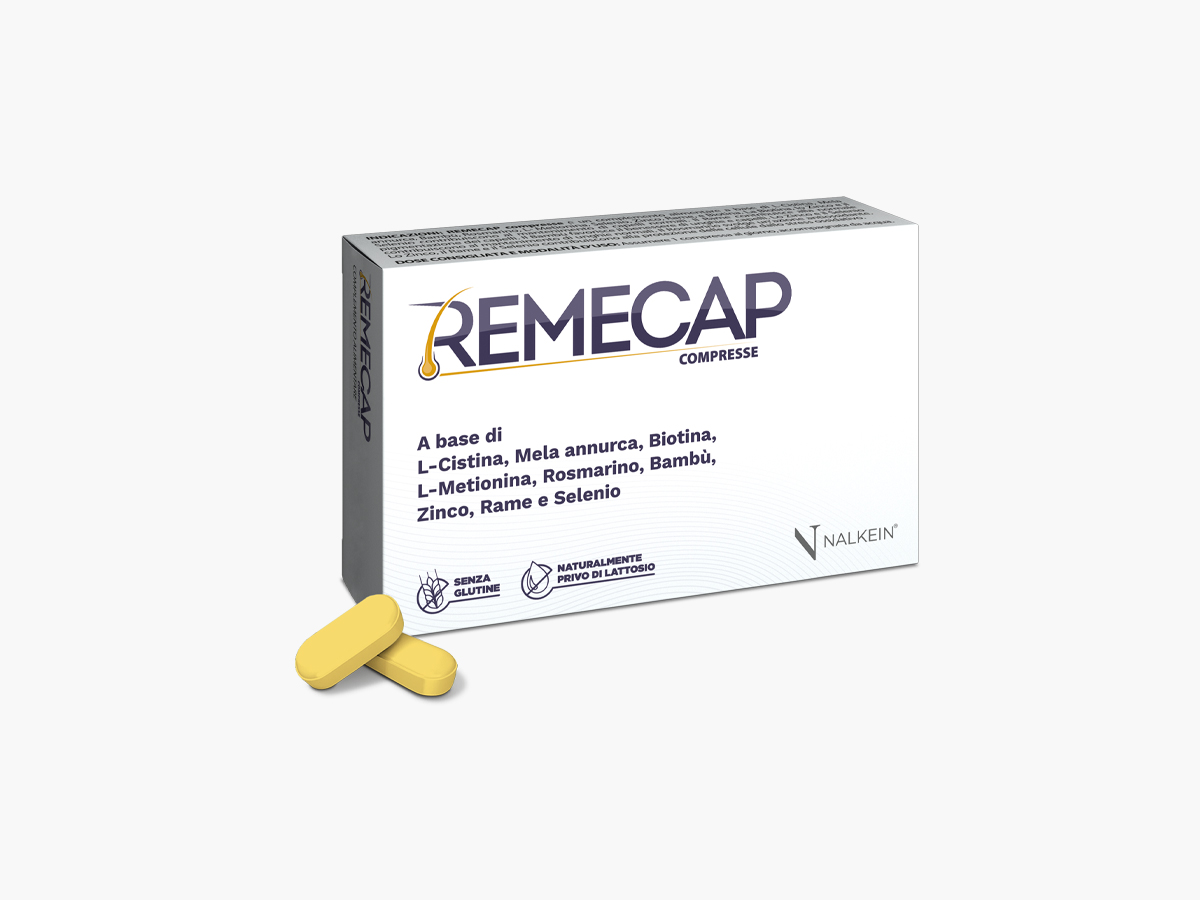 REMECAP compresse è un complemento alimentare a base di L-Cistina, Mela annurca, Biotina, L-Metionina, Rosmarino, Bambù, Zinco, Rame e Selenio. La Biotina, lo Zinco ed il Selenio contribuiscono al mantenimento di capelli normali. Il Rame contribuisce alla normale pigmentazione dei capelli. Il Bambù favorisce il benessere di unghie e capelli. Lo Zinco ed il Selenio contribuiscono al mantenimento di unghie normali. Il Rosmarino svolge un’azione antiossidante. Lo Zinco, il Rame ed il Selenio contribuiscono alla protezione delle cellule dallo stress ossidativo.