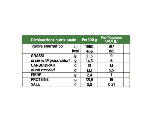 INGREDIENTI: Miscela proteica: proteine del latte, gelatina idrolizzata; farina di frumento (glutine), olio di palma, pasta di cacao, zucchero, fruttosio, emulsionante: lecitina di soia; burro di cacao, aromi, cacao magro in polvere, proteine del pisello, farina di soia, olio di girasole, sale, grasso di latte, agente lievitante: bicarbonati; farina di mais. Può contenere tracce di frutta a guscio.