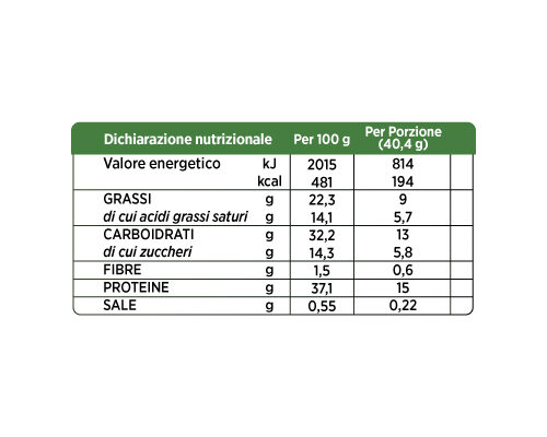 INGREDIENTI: Miscela proteica: proteine del latte, collagene idrolizzato; farina frumento (glutine), calcio carbonato, olio di palma, saccarosio, fruttosio, burro di cacao, latte scremato in polvere, pasta di cacao, emulsionante: lecitina di soia; aromi, grasso del latte, proteine del pisello, farina di soia, olio di girasole, sale, agente lievitante: bicarbonati; farina di mais. Può contenere tracce di frutta a guscio.